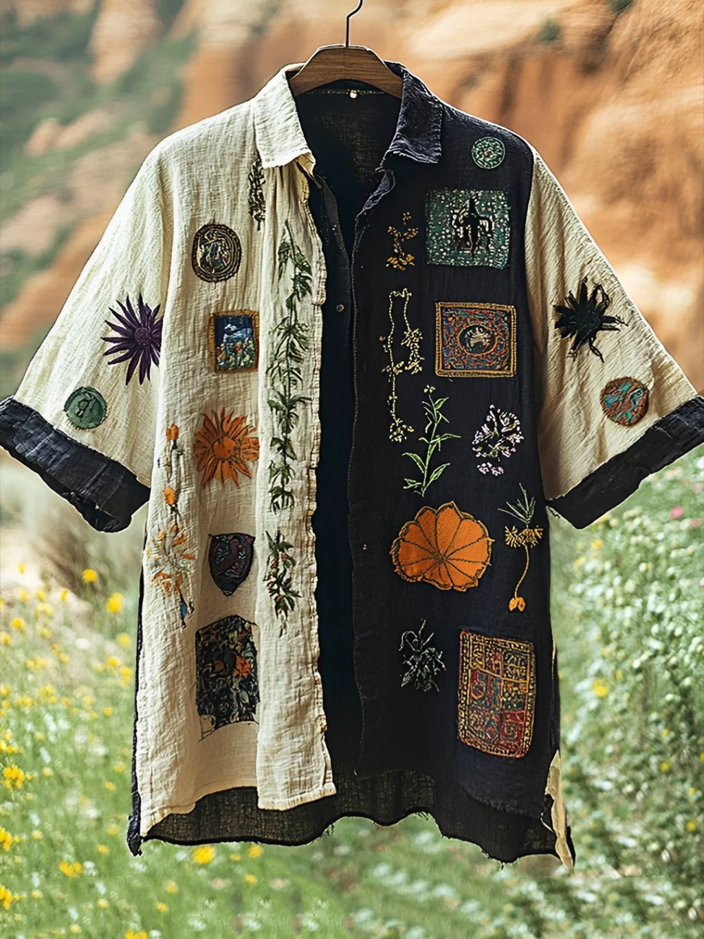 This unique shirt is a wearable mosaic, featuring a striking spliced colorblock design that contrasts light and dark halves. Adorned with a variety of intricate embroidered and printed patches, it evokes a handcrafted, bohemian feel. From flowers and plants to abstract symbols, each detail adds to the shirt's rich character. Crafted for a relaxed fit, it's a true statement piece for those who appreciate one-of-a-kind style.